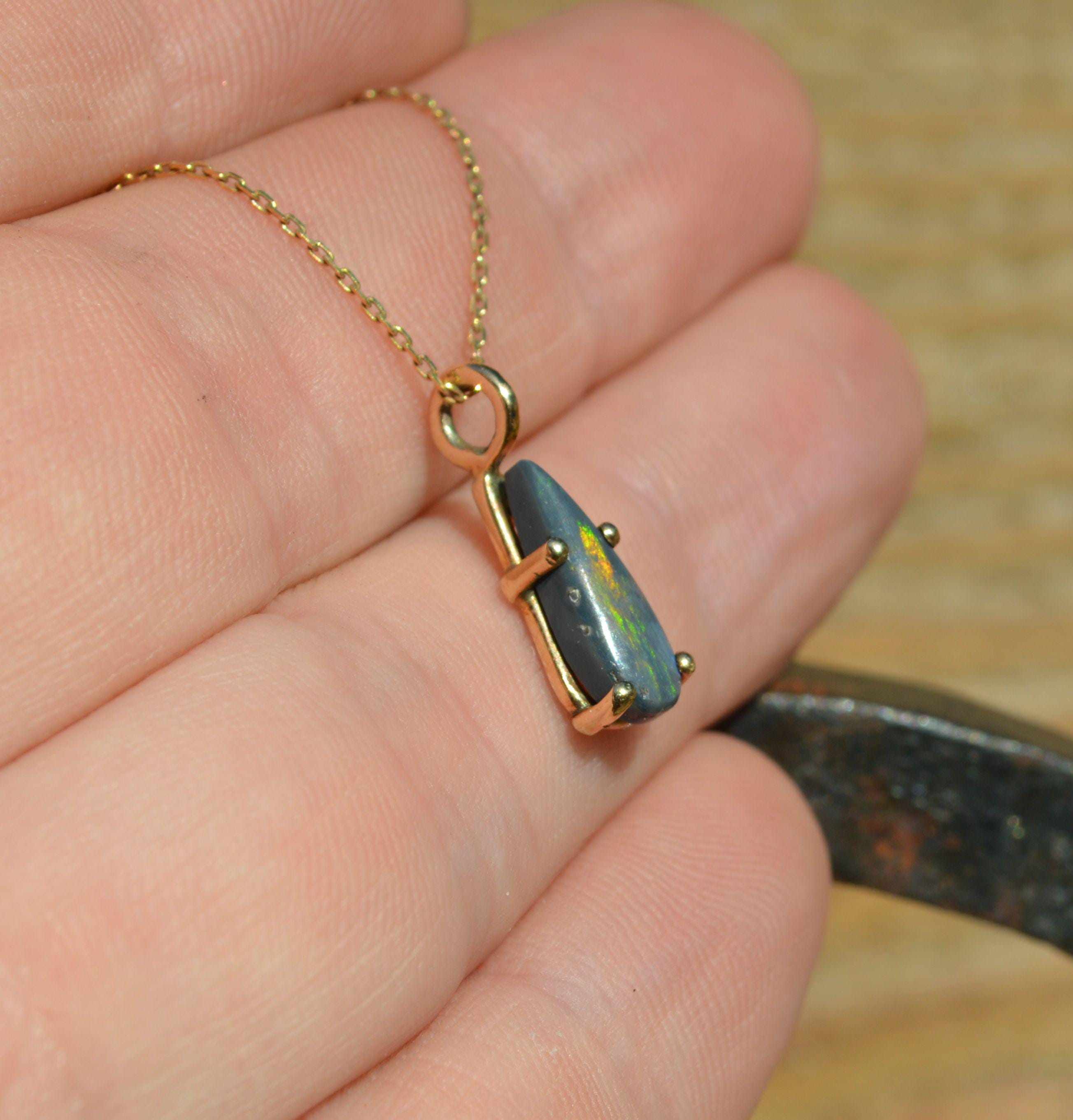 Natural Solid Black Opal Set within a Traditional 9ct Yellow Gold Claw Setting With Large Pendant Loop.
